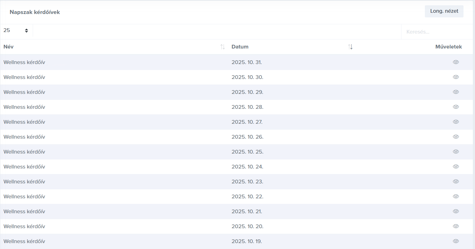 Lentebb láthatod a Napszak kérdőíveket. A sorok végén található szem ikonra kattintva, további részleteket tekinthetsz meg.