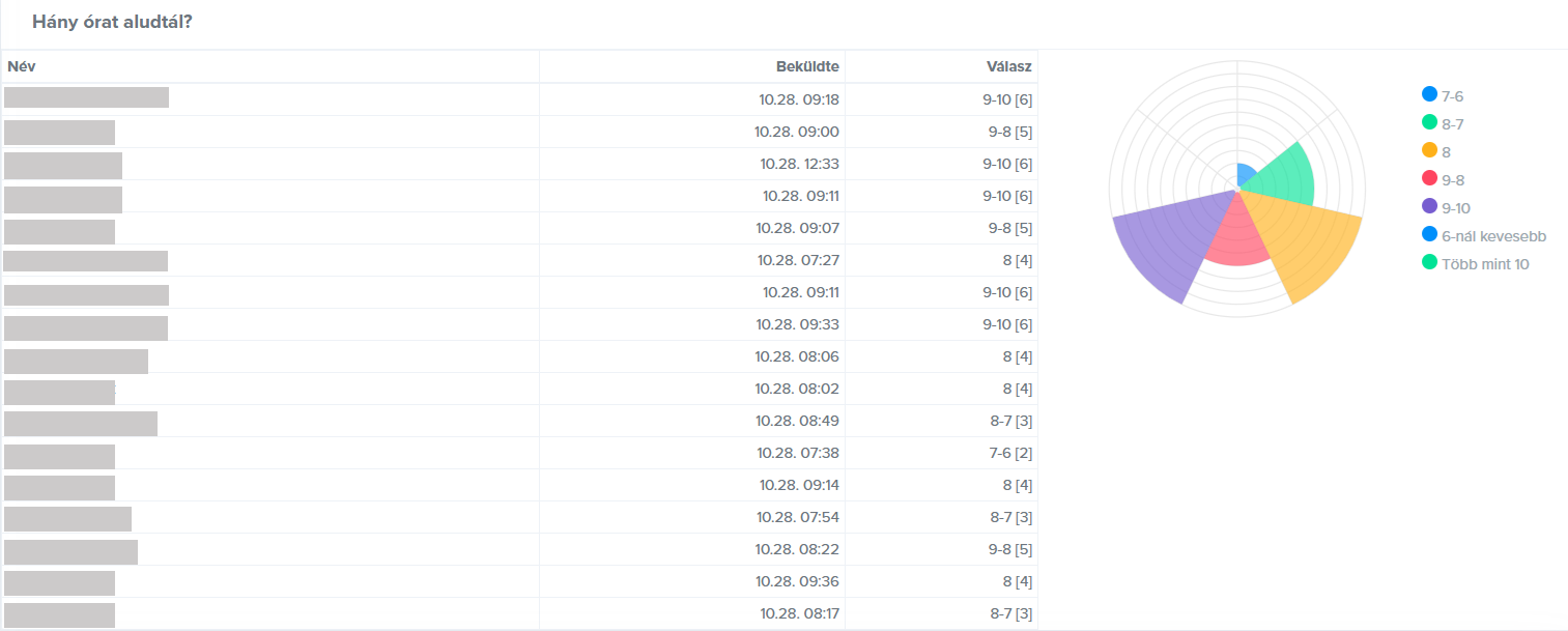 A táblázat alatt kérdésekre lebontva látod, hogy milyen válaszok, illetve milyen arányban érkeztek a játékosoktól, illetve egy diagram is jelzi számodra az értékeket.