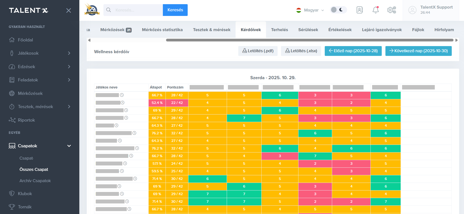 Adott wellness kérdőívről szóló színes jelöléseket láthatsz a táblázatban, amely jelzi a játékosok eredményeit, így azonnal szembetűnőek a kiugróan pozitív, valamint negatív értékek.