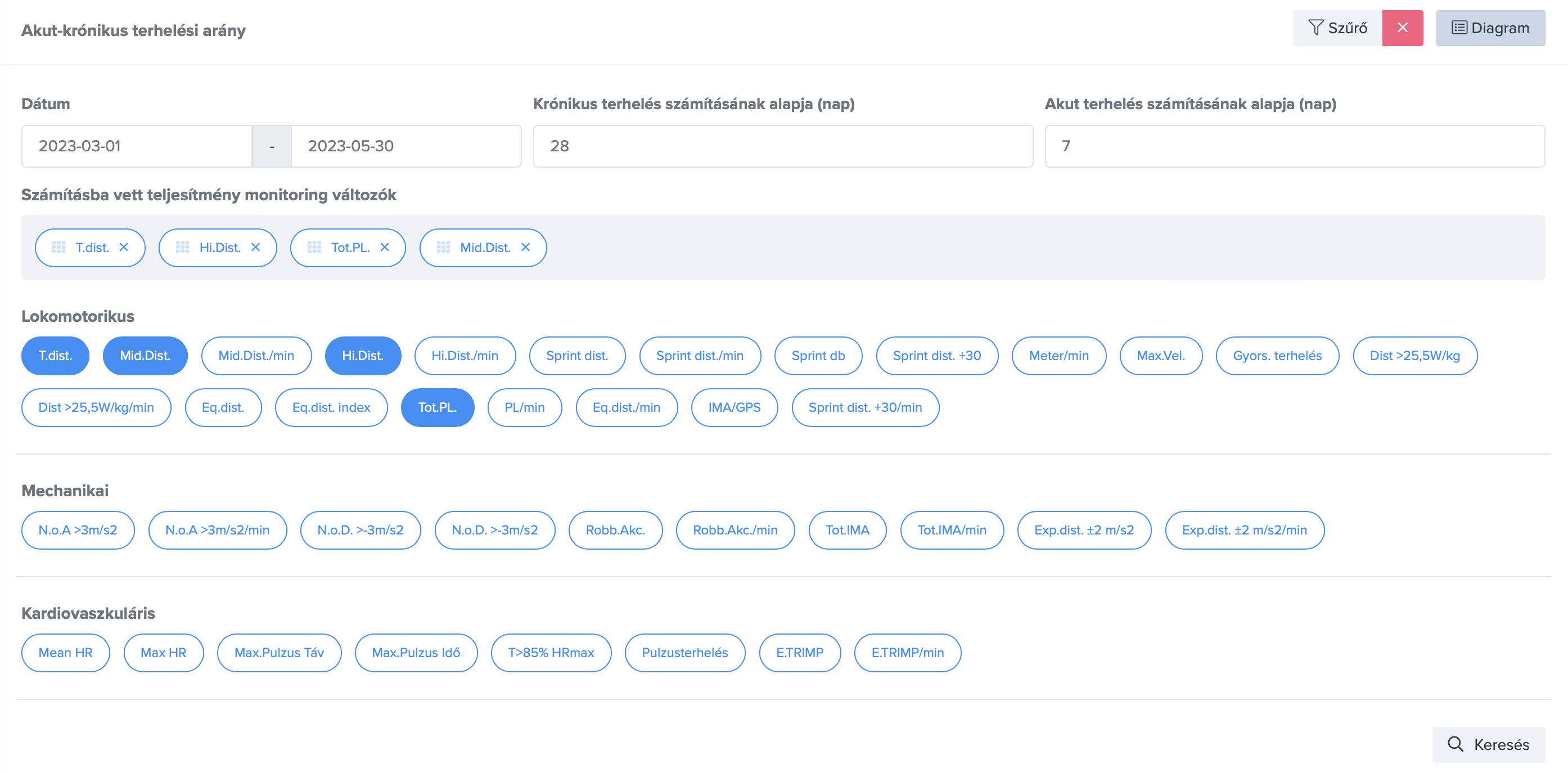 Szűrő segítségével beállítható az akut és krónikus időablak, valamint a paraméterek is.