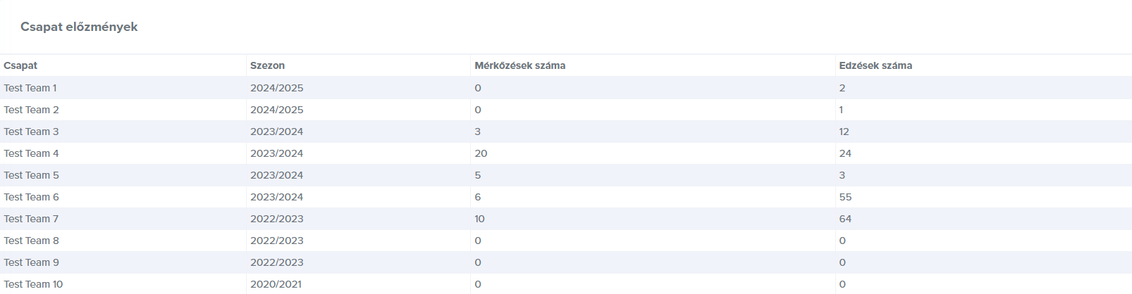 A rendszer lehetőséget biztosít arra is, hogy a játékos korábbi csapatai mellett a mérkőzéseken és edzéseken való részvételeinek számát is rögzítsük.