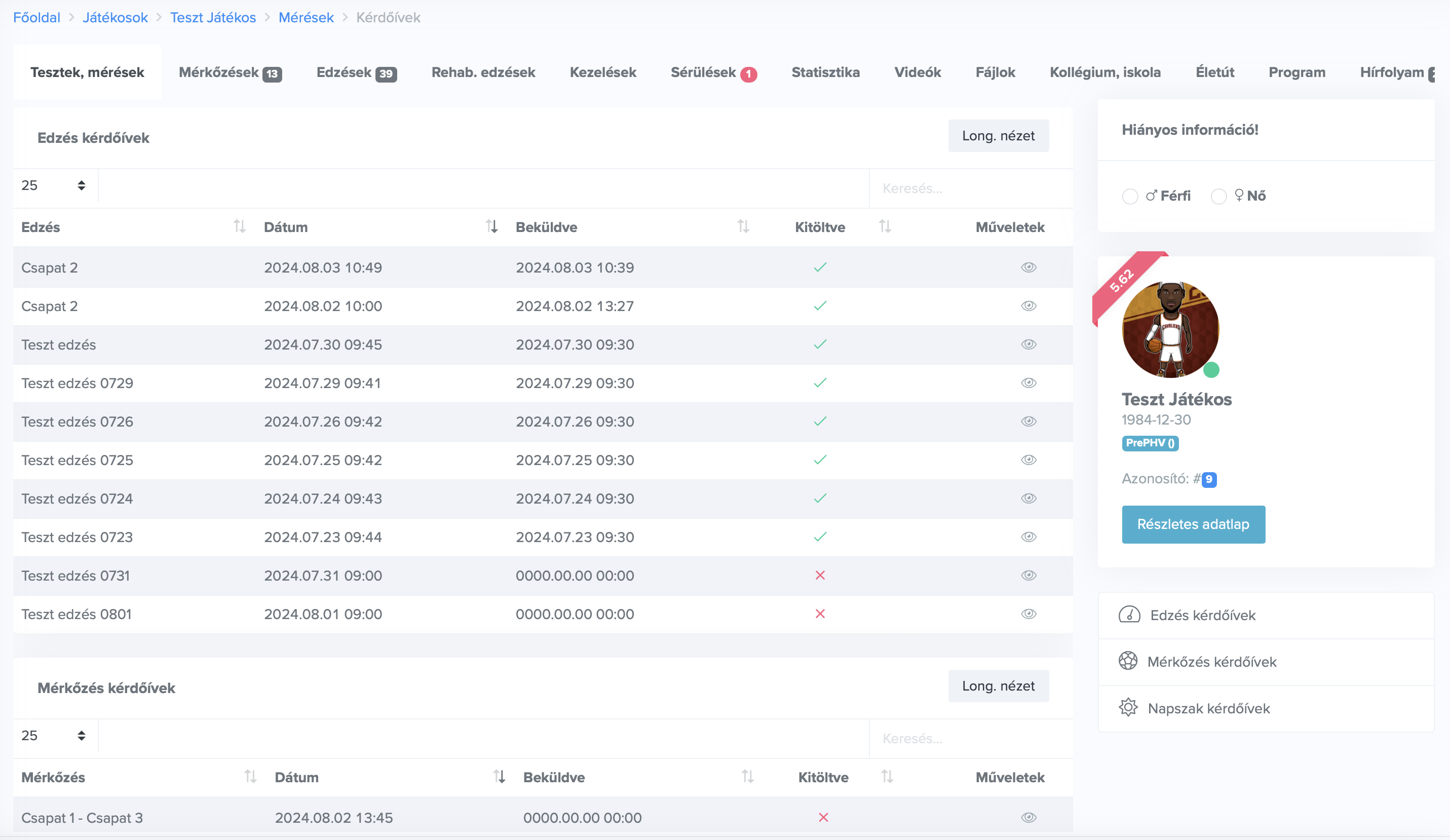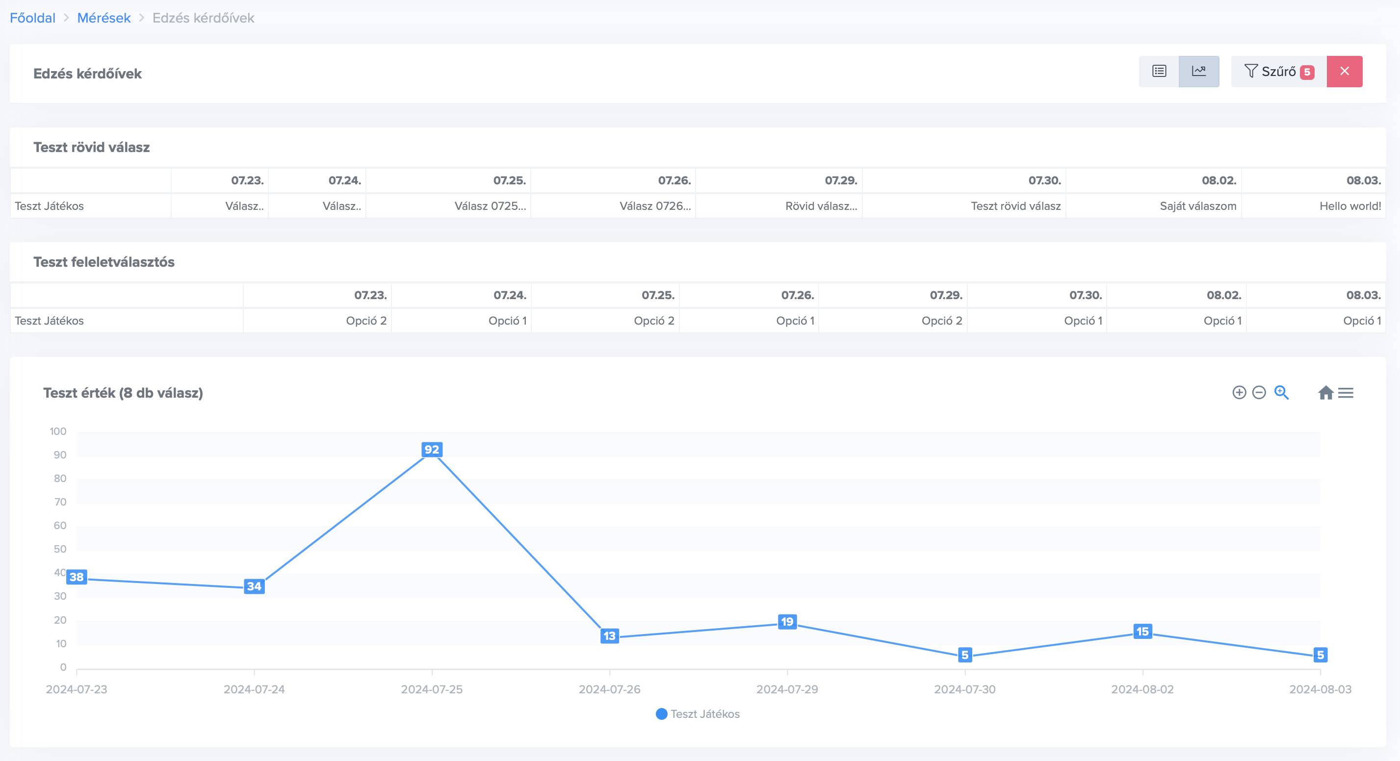 Ebben a modulban a játékos kérdőíveire adott válaszait nézheted meg többféle nézetből is. Első amit láthatsz, hogy a játékos mely napokon milyen kérdőíveket kapott, kitöltötte-e és ha igen, mikor. A sor végén található szem ikonra kattintva megtekintheted a kérdőívre adott napi válaszokat.