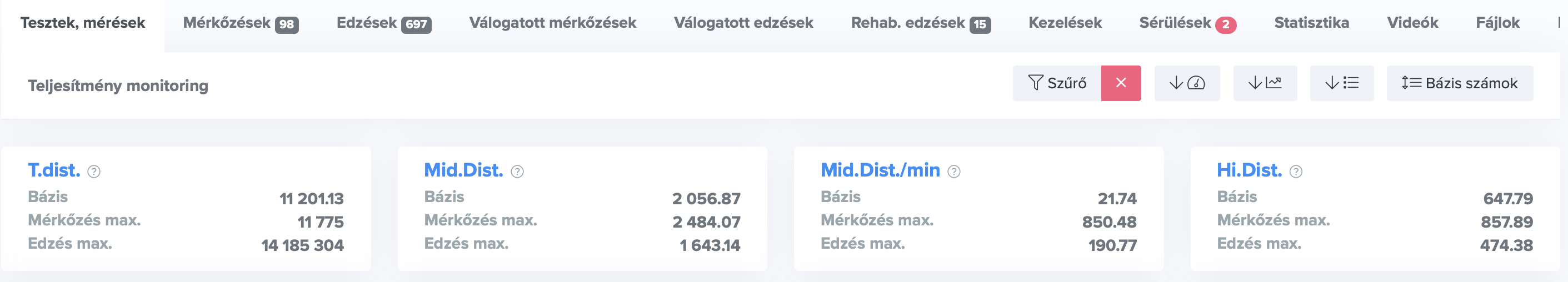 A játékos edzés és mérkőzés teljesítmény monitoring adatait megjelenítő modul. A fejlesztés során próbáltuk a felhasználói igényeknek legjobban megfelelő kimutatásokat, ábrákat és táblázatokat elkészíteni, mely napi szinten segítheti a szakemberek munkáját.