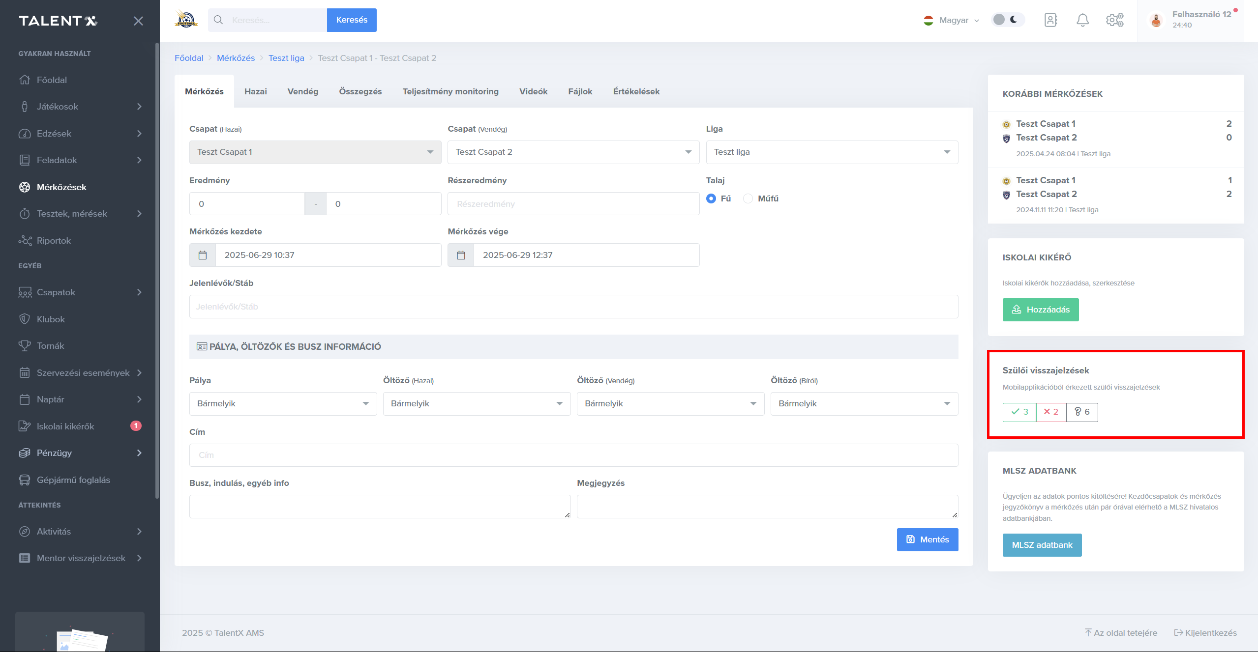 A jobb oldalon található „Szülői visszajelzések” mezőben láthatod, hogy az adott mérkőzéshez tartozó játékokhoz társított szülők, hogyan jeleztek vissza a TalentX AMS mobil applikáción keresztül. A mobil applikációról részletesebben itt olvashatsz.