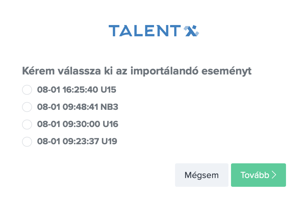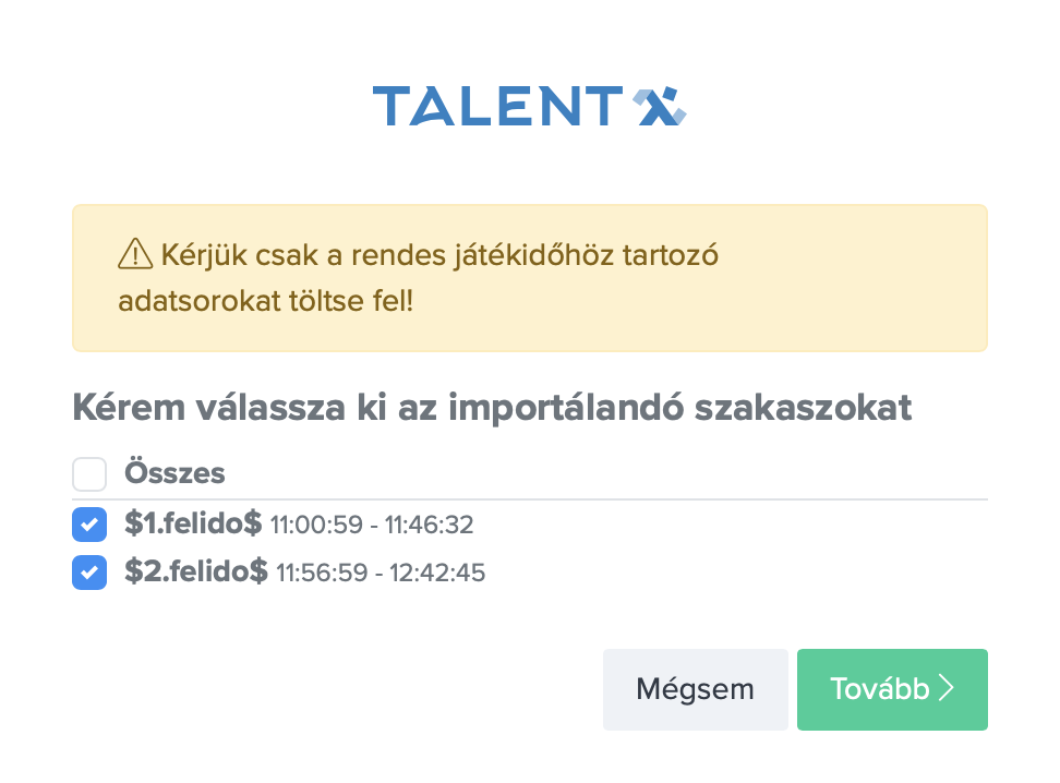 - 3. lépés: A megfelelő esemény kiválasztása után, válaszd ki az importálni kívánt szakaszokat. Fontos, hogy mérkőzések esetén csak a tiszta játékidőt tartalmazó szakaszokat töltsd fel.