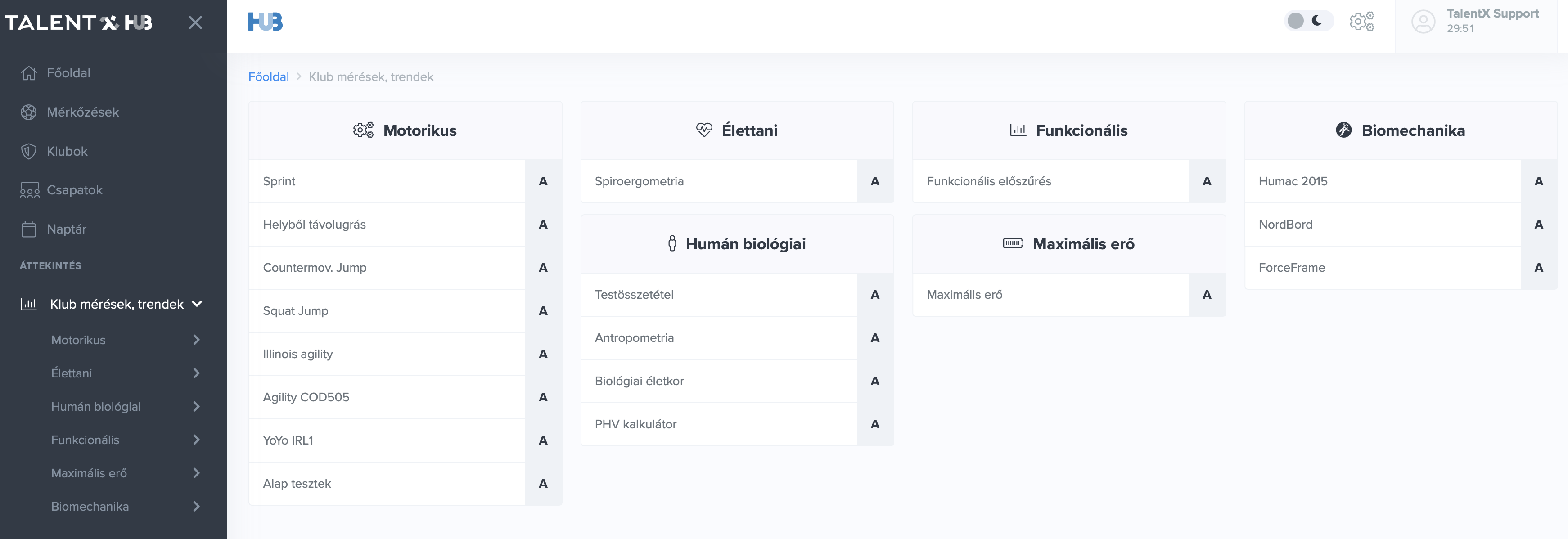 Ebben a modulban hozzáférhetsz a saját, illetve a többi sportszervezet összes tesztjének, mérésének eredményéhez. Ezeket a méréseket természetesen kizárólag aggregált módon, teljesen névtelenül érheted el.