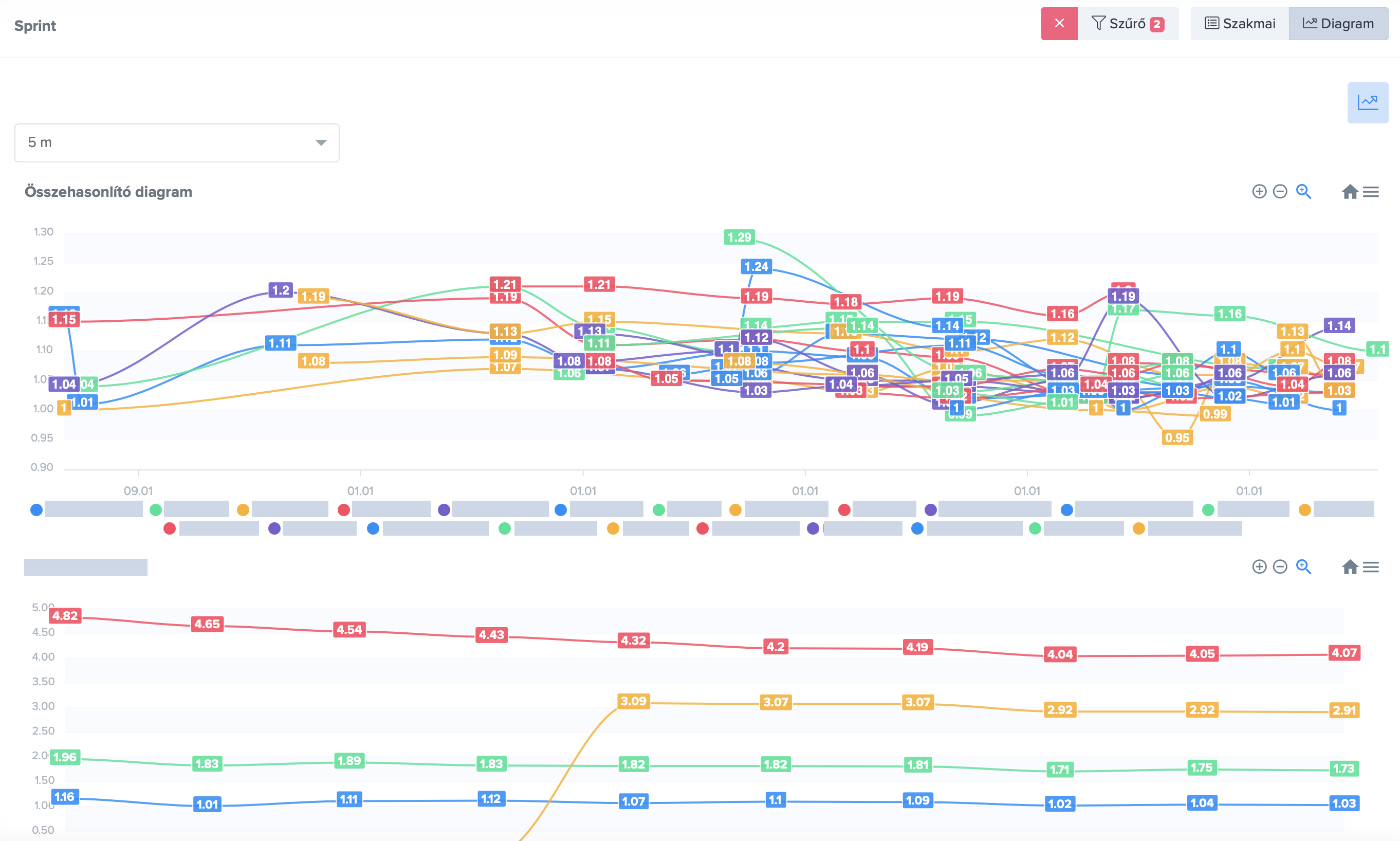 - Diagram nézet: A szűrési feltételnek megfelelő játékosok longitudinális fejlődési görbéjét egy diagramon ábrázolja, majd alatta a játékosok eredményeit egyesével is megmutatja.