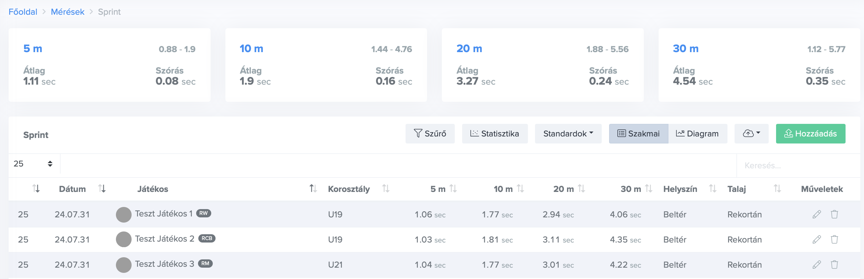 - Szűrő: Az adathalmaz elemei között szűrhetünk. Csapatra, játékosra, a mérés dátumára, játékosok posztjára és születési dátumukra is.