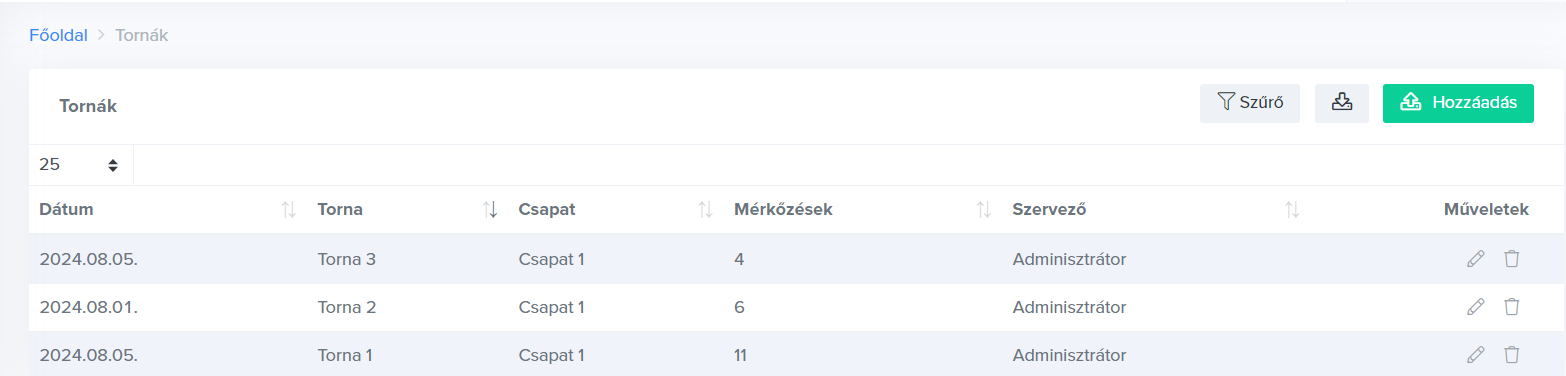 A rendszerben lehetőséged van tornákat rögzíteni, majd ezekhez további adatokat társítani pld. játékosok, mérkőzések, stb.