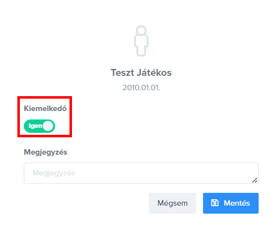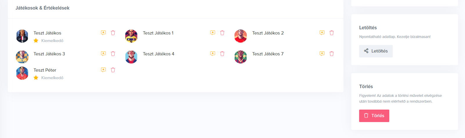 Lehetőséged van a társított játékosokhoz egyéni értékelést rögzíteni a sárga komment gombbal, illetve a szemetes ikonnal törölhetsz is játékosokat.