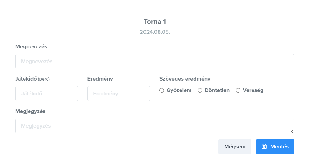Tornát a „Hozzáadás” gombbal rögzíthetsz a kért adatok megadása (torna neve, csapat aki részt vett, torna dátuma, valamint igény szerint megjegyzést is társíthatsz), illetve a „Mentés” gomb megnyomásával.