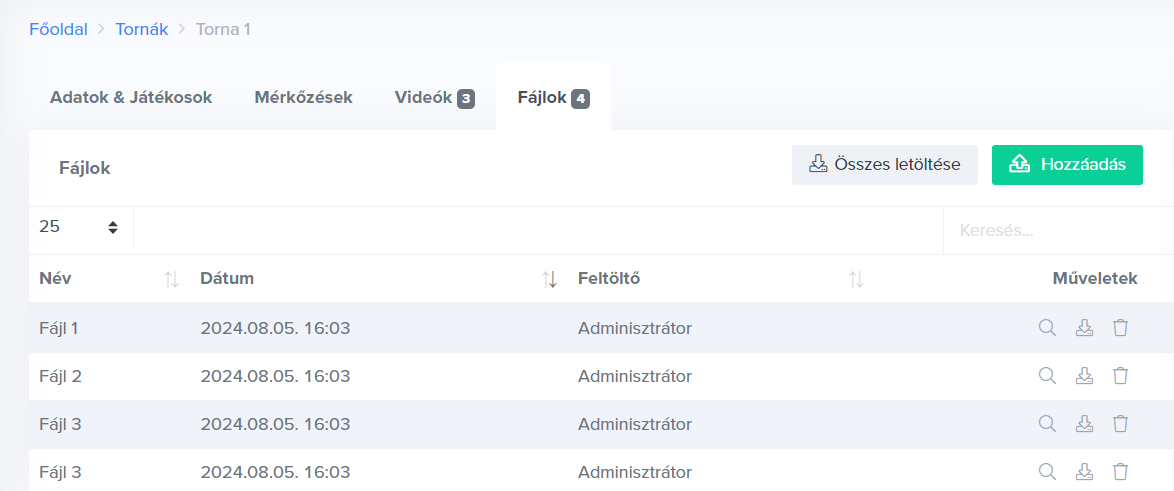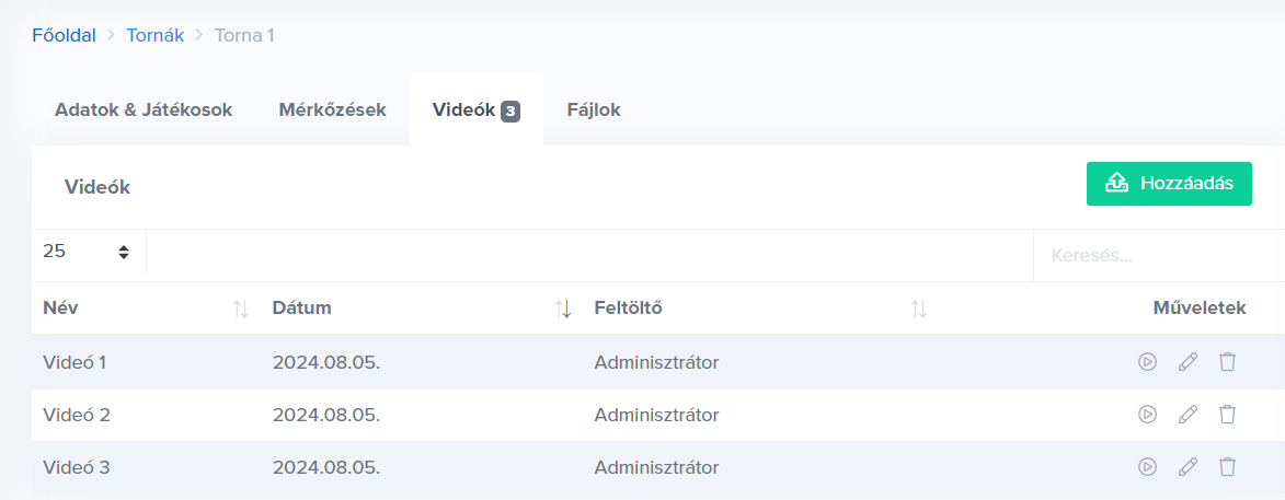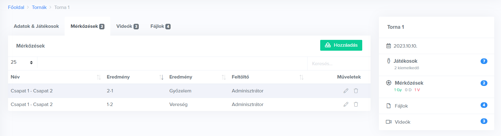 A tornákhoz lehetőséged van mérkőzéseket rögzíteni a „Hozzáadás” gombbal.