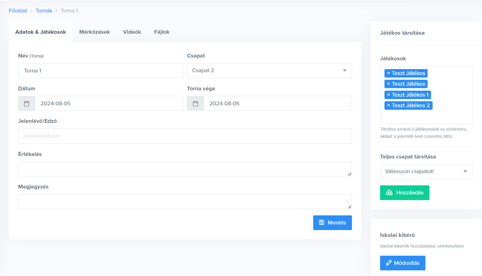 Torna rögzítése után a rendszer átirányít a tornához kapcsolódó további adatok megadásához. Az Adatok & Játékosok menüpontban megadhatod a további tornához társuló adatokat (jelenlévők, edzők, rövid szöveges értékelés, megjegyzés), illetve szerkesztheted a már kitöltött mezők tartalmát.